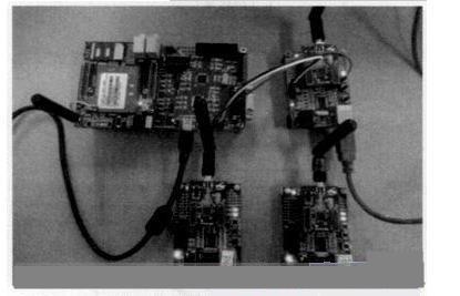 图7为所开发出的测试系统的实物展示图。在图7的中上部,左边是协调器结点的lpc11c14板,右边是协调器结点的cc2530板。在lpc11 c14板中,左边带有天线的部分是商品化的gprs模块。在cc2530板中,中上部带有天线的部分是商品化的zigbee射频模块。由于这两部分的频率均处于微波频段,因此为保证可靠性采用商品化的成熟模块。在图7的中下部,左边是路由器结点,右边是终端结点。为保证测试效果,这两个结点在测试时均采用的是商品化的zigbee模块,测试通过后可将底板替换为自己开发的底板(即:目前协调器结点中cc2530板所用的底板)。