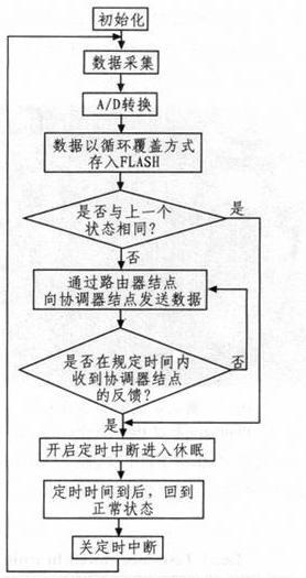 终端结点的主程序流程图如图5所示。初始化后对车位检测传感器进行数据采集,得到的数据经过cc2530自带的a/d模块进行ad转换,然后以循环覆盖的方式存入cc3530内部的flash。之后,判断当前状态与上一个状态是否相同。若车位状态发生变化,由zigbee射频模块通过路由器结点向协调器结点发送数据,并等待协调器结点的反馈。若在规定的时间内没有收协调器结点的反馈,则重发数据;若收到反馈,则开启定时中断后进入休眠状态。接下来等待定时中断唤醒,进行下的数据采集。