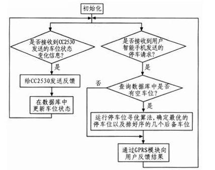 协调器结点中lpc11c14的主程序流程图如图3所示。上电后首先完成初始化。若接收到cc2530发送的车位状态变化信息,给cc2530发送反馈,随即更新数据库。若接收到停车请求,则根据数据库中的车位当前状态,判断有无空闲车位。若有空闲车位,运行停车位寻优算法,确定停车位。之后,通过gprs模块向用户反馈结果。