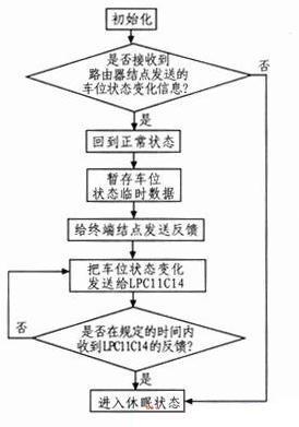 协调器结点中cc2530的主程序流程图如图4所示。初始化后,首先判断是否收到车位状态变化消息。若未收到,进入休眠状态;若收到,则从休眠状态回到正常状态。接下来,为防止车位状态存储到数据库前丢失,需在cc2530内部的flash存储器中临时存放。之后,通过路由器结点给终端结点发送反馈。,把车位变化信息发送给lpc11c14并等待反馈。若在规定的时间内没有收到反馈,则重发;若收到反馈,则进入休眠状态。