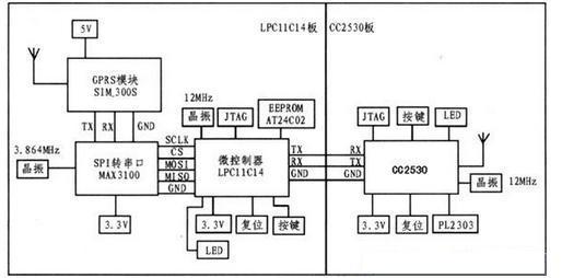 gprs模块采用通用模块sim_300s。lpc11c14板的电源芯片采用mic5209,cc2530板的电源芯片采用ht7533。协调器结点的总体硬件框图如图2所示。