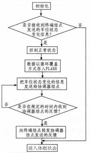 路由器结点的主程序流程图如图6所示,若接收到终端结点发送的车位状态变化信息,则产生外部中断,从休眠状态回到正常状态。然后以循环覆盖的方式存入cc3530内部的flash.接着将车位状态变化的信息发送给协调器结点,并等待协调器结点的反馈。若在规定的时间内没有收到反馈,则进行重发;否则,向终端结点转发协调器结点发送的反馈,之后进入休眠状态,等待外部中断唤醒。