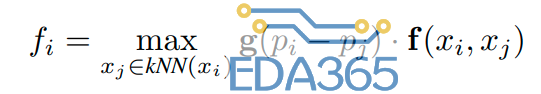 对于一个点集 x,其中每一个点由其集合位置 p_i 以及 d 维的特征 f_i 组成,我们想要生成一个 x’,本文设计了图卷积用于聚合从 x 到 x’ 的特征。与 pointnet++的采样层相类似,本文首先从 n 个点中采样 n’ 个点,通常 k 最近邻(knn)被用来在采样中保留局部信息将其作为中心点特征。