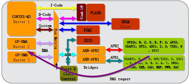 //双高级外设总线结构:高速apb(apb2)速度达到72mhz、低速apb(apb1)速度达到36mhz。
